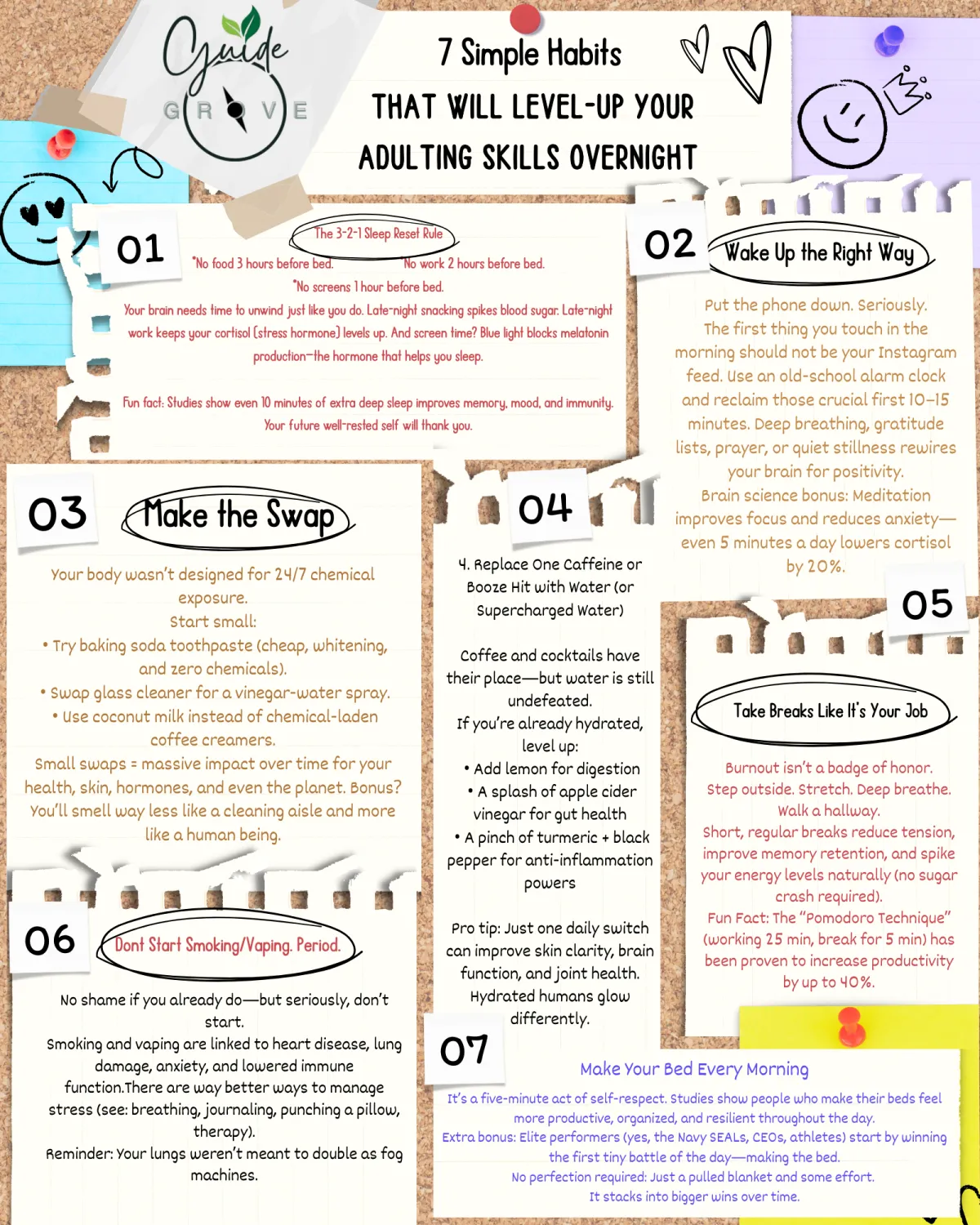 “7 Simple Habits to Level-Up Your Adulting” tips to print, save and share